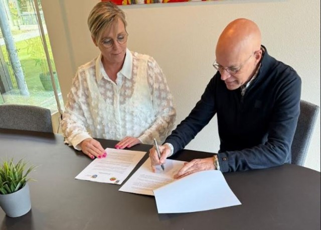 Tekenmoment Heidy Haandrikman (Directeur Zorg/Bedrijfsvoering NNCZ) en Wim Miedema ([waarnemend] voorzitter van de dorpsraad Grijpskerk)