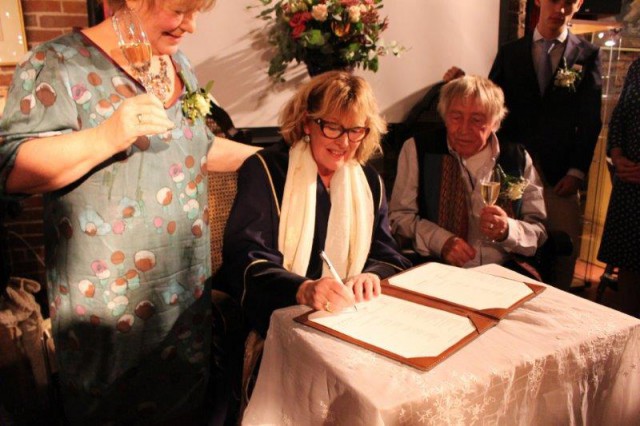 Het werd een enerverende middag met veel hoogtepunten. Het stel, dat al 37 jaar samenwoonde in het prachtige 'Dickenshuis'te Saaksum, had al hun vrienden en kennissen in 't Waarhuis uitgenodigd voor het vieren van een verjaardagsfeestje. Al snel werd duidelijk dat er toch nog meer aan de hand was. Ingrid Trouw en Hiero Oosterbaan hadden namelijk besloten om een trouwboekje aan te schaffen.