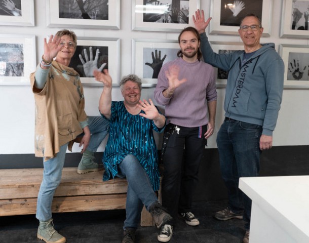 De lange witte wand in de fotowinkel van Rudie Wiersma Fotografie is veranderd in een muur vol vrolijk zwaaiende handen. Fotogroep InFocus exposeert namelijk opnieuw op deze plek,helaas wel voor de laatste maal.