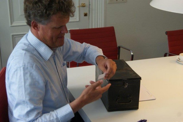 Edwin had het er maar druk mee, lootjes knippen, in de originele trekkingsbus van Notaris Smid mikken en de administratie bijhouden.