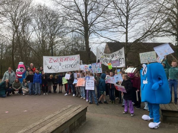Van de Adeborg deden ongeveer 135 kinderen mee. Ze hielden op het schoolplein een flink aantal actieborden omhoog en de inhoud loog er niet om.