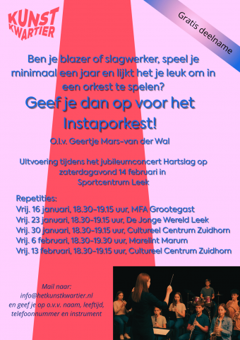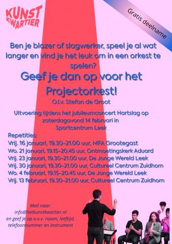 Op 1 januari 2026 bestaat Het KunstKwartier 5 jaar en dat wordt gevierd in de vorm van het jubileumconcert Hartslag op zaterdagavond 14 februari in Sportcentrum Leek (aanvang 19.00 uur).