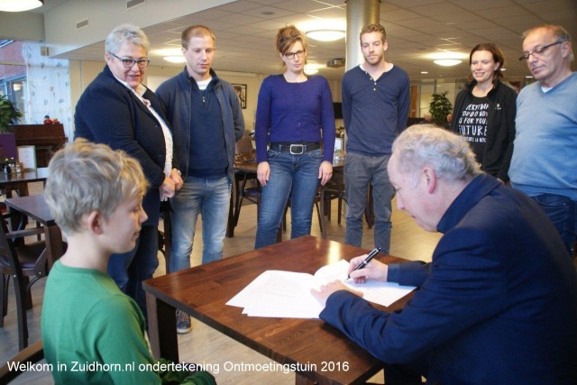 Aanwezig bij de ondertekening waren Peter Kampsma en Ingrid Stiekema van het Zonnehuis, Sandra ter Veen van SWGZ, Willem Oosting van De Zijlen, Leo Dop van de gemeente Zuidhorn, Jeroen Hummel van Hummeltuintotaal en student van de Hanzehogeschool Groningen René Kamminga die het project begeleidde.
