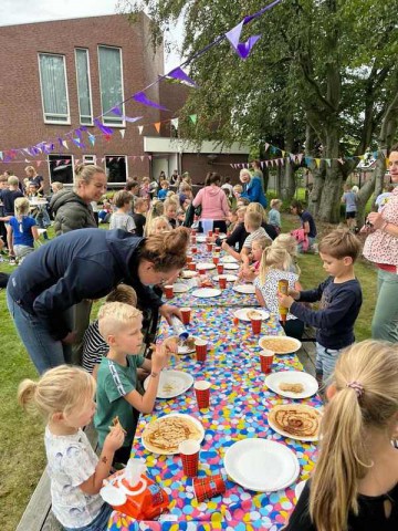 Vanaf 12.00 genoten de kinderen volop. Na het gezamenlijk pannenkoek eten, wat dankzij het mooie weer lekker buiten kon, volgde kindertheater in de kerk.