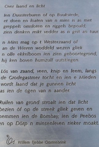Ter gelegenhheid van de afsluiting van het Landinrichtingsproject Lutjegast Doezum onthulde gedeputeerde Henk Staghouwer een plaquette met het gedicht ‘Over laand en licht’ van Willem Tjebbe Oostenbrink uit Zuidhorn. Oostenbrink won vorig jaar de Borsla-prijs voor zijn gedichtencyclus ‘Tussen tied en stroom’, vijf gedichten geschreven in het Westerkwartiers.
