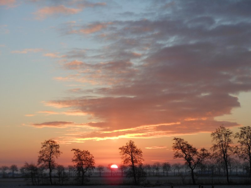 Op de foto: Zaterdagmorgen een zeer fraaie zonsopkomst in Zuidhorn, 12 januari 2013.