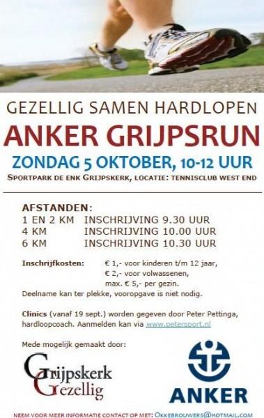 Grijpskerk Gezellig organiseert voor de eerste keer een hardloopevenement op zondagochtend 5 oktober 2014 van 10-12 uur door sportpark De Enk in Grijpskerk. Een hardloopevenement voor jong en oud, gezinnen en fanatiekelingen. De afstanden zijn 1, 2, 4 en 6 km, dus de allerjongsten kunnen met hun opa of oma zelfs meedoen. Dat is ook het doel van organisatie. Samen gezellig hardlopen en meedoen is belangrijker dan winnen. Het is een week voor de 4 mijl van Groningen dus een mooie opwarmronde vooraf. Inschrijving is niet nodig, je kunt je opgeven op de dag zelf bij de tennisclub TC West End vanaf 9.30 uur voor de 1 en 2 km. Daar vindt ook de start en finish plaats. Inschrijfkosten bedragen € 1,- voor kinderen t/m 12 jaar, € 2,- voor volwassenen. Anker Verzekeringen is bereid gevonden als hoofdsponsor van het evenement. Vooraf aan dit hardloopevenement kunnen hardlopers ook deelnemen aan clinics (vanaf 19 september), gegeven door hardloopcoach Peter Pettinga. Mensen kunnen zich daarvoor opgeven via zijn site http://www.petersport.nl Grijpskerk Gezellig hoopt een grote opkomst, zodat ze er een jaarlijks festijn van kunnen maken.