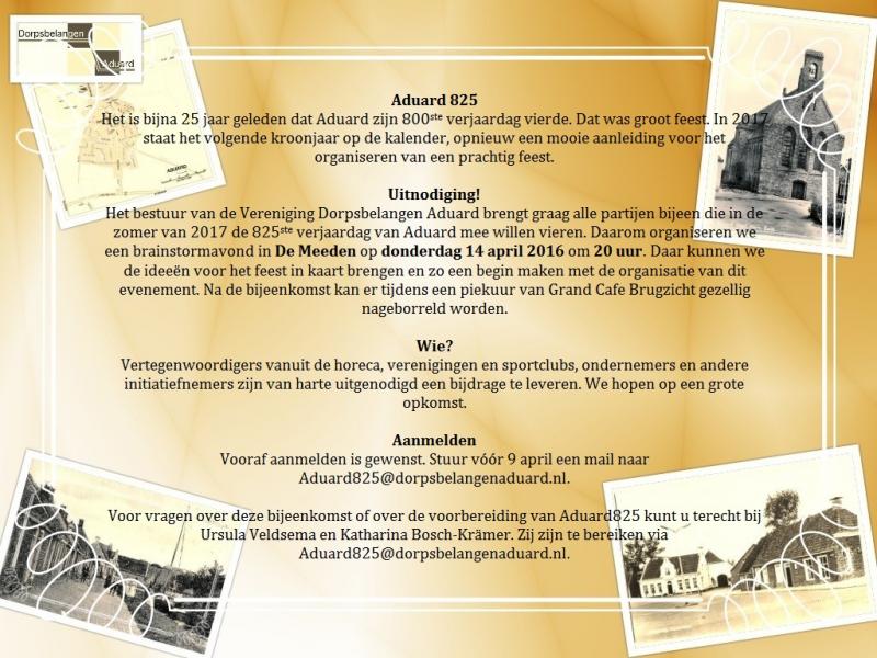 Het bestuur van de Vereniging Dorpsbelangen Aduard brengt graag alle partijen bijeen die in de zomer van 2017 de 825ste verjaardag van Aduard mee willen vieren. Daarom organiseren we een brainstormavond in De Meeden op donderdag 14 april 2016 om 20 uur. Daar kunnen we de ideeën voor het feest in kaart brengen en zo een begin maken met de organisatie van dit evenement. Na de bijeenkomst kan er tijdens een piekuur van Grand Cafe Brugzicht gezellig nageborreld worden.