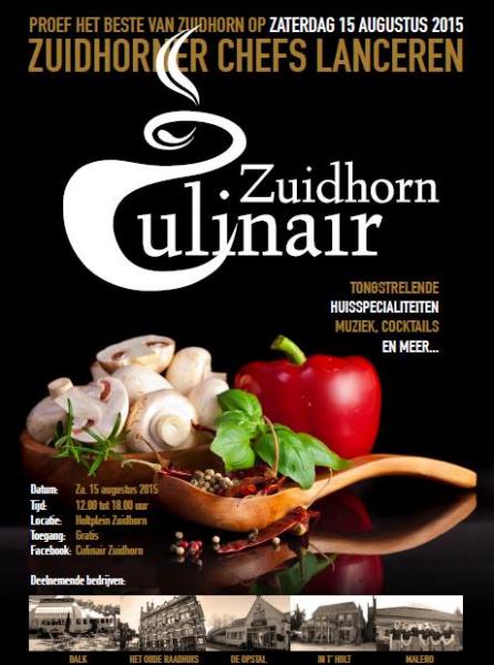 Onder de noemer Culinair Zuidhorn kunnen bezoekers kennis maken met de huisspecialiteiten van de chefs van Restaurant Balk, Bistro het oude Raadhuis, Restaurant & Eetcafé De Opstal, Irish Dutch Hotel In’t Holt en Lunchroom & IJssalon Malero.