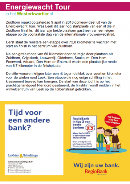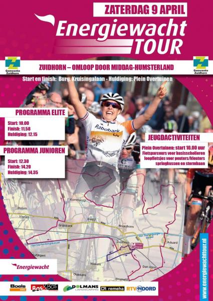 - De zesde editie van de Energiewacht Tour voor vrouwen heeft op zaterdag 9 april tijdens de Omloop door Middag Humsterland met start en finish in Zuidhorn en de individuele tijdrit in Leek elf internationale merkenteams, zes nationale ploegen en zeven clubteams aan het vertrek. Met de komst van de vijf hoogst geplaatste teams van de ranglijst van de internationale wielerbond UCI weet koerdirecteur Danielle Lissenberg-Bekkering zich weer verzekerd van een topdeelnemersveld van 6 tot en met 10 april. De Nederlandse ploegen Rabo-Liv (de formatie van tweevoudig ritwinnares van 2015 Anna van der Breggen) en Boels-Dolmans zijn present, net als het Britse Wiggle-High 5, het Duitse Canyon-Sram en het Australische Orica-AIS.