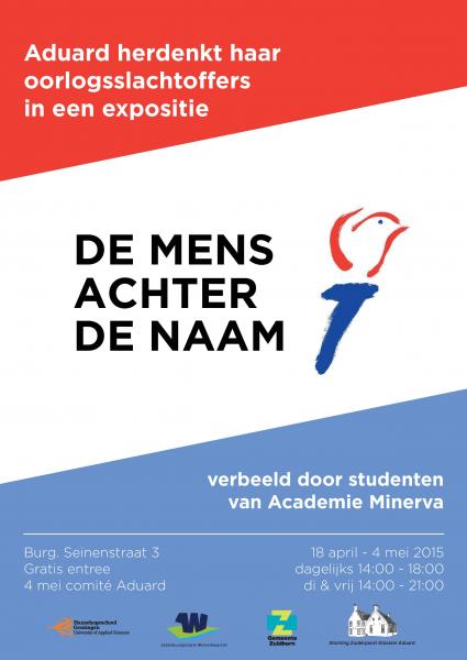 Unieke expositie vanaf 18 april 2015 in het Rechthuis van Aduard. Aduard kent achttien slachtoffers uit de Tweede Wereldoorlog. Tweede- en derdejaars studenten van Academie Minerva van de Hanzehogeschool Groningen hebben een veelzijdige vertaling gemaakt van de verhalen van de slachtoffers. Op deze wijze wordt de mens achter de naam zichtbaar.