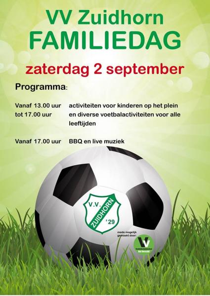De familiedag begint om 13.00 uur tot 15.00 uur met een gevarieerd voetbalprogramma voor de F-, E-, D- en C-Jeugd.