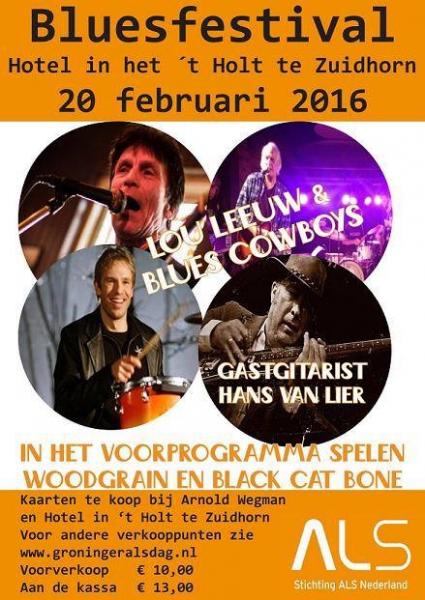 De stichting GroningerALSdag organiseert de GroningerALSdag Bluesfestival op 20 februari 2016 in de mooie bovenzaal in Hotel in ’t Holt te Zuidhorn.