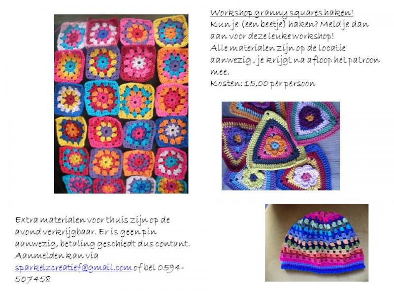 Heb je de basis workshop gevolgd? Is het al een tijd geleden dat je hebt gehaakt maar wil je het graag weer oppakken? meld je dan aan voor deze leuke workshop! Granny Squares zijn voor heel erg veel haakwerken te gebruiken! Een tas, kussen, je kunt zelfs slofjes van granny squares maken! Er zijn vele soorten Granny’s. Tijdens deze workshop maakt je met een aantal kennis en de mogelijkheden ervan.