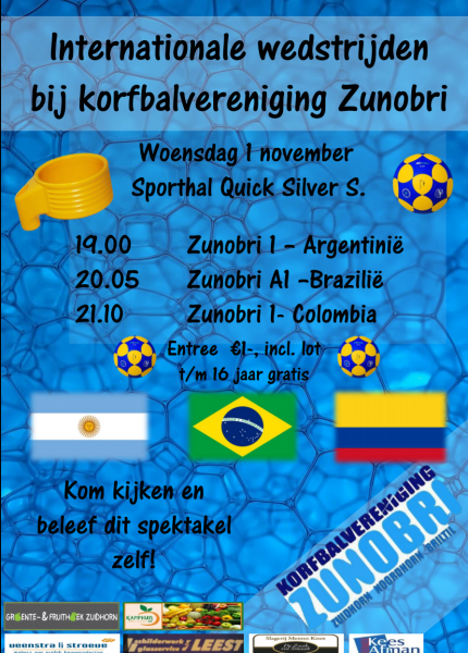 Zunobri gaat internationaal en oefent in Zuidhorn tegen 3 buitenlandse teams. Alle wedstrijden duren 40 minuten met 10 minuten pauze tussendoor. Om 19.00 gaan we van start met de eerste wedstrijd. Entree is slechts 1euro inclusief programmaboekje en lot.
