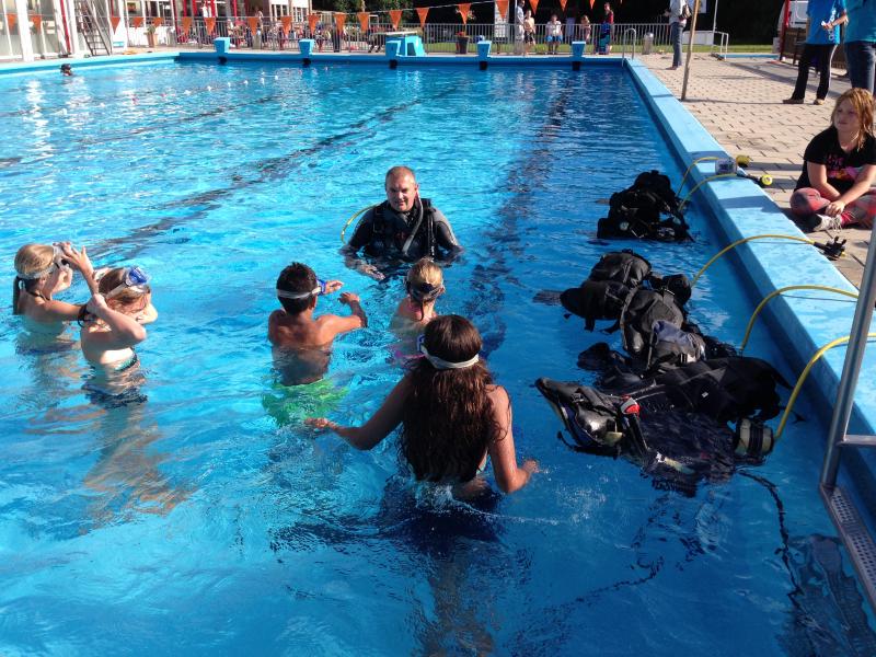 Duiken met echte duikflessen in het zwembad. Vanaf 10 jaar € 5.00