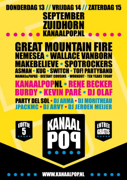 Ook zullen de toppers van de afgelopen vier jaar weer terugkeren op het KanaalPOP podium als Spotrockers, Switch, Tof Partyband, MakeBelieve, Asman en KUG. Daarnaast verzorgt Nemesea ook een spetterend optreden!