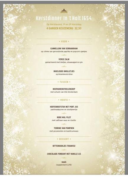 Kerstmis begint bij ons al op kerstavond: drie dagen lang serveren wij het kerstmenu! Maar je hoeft niet alle dagen te komen hoor. Je mag ook gewoon een dag uitkiezen. Daarom heet het misschien wel een keuzemenu. www.intholt1654.nl