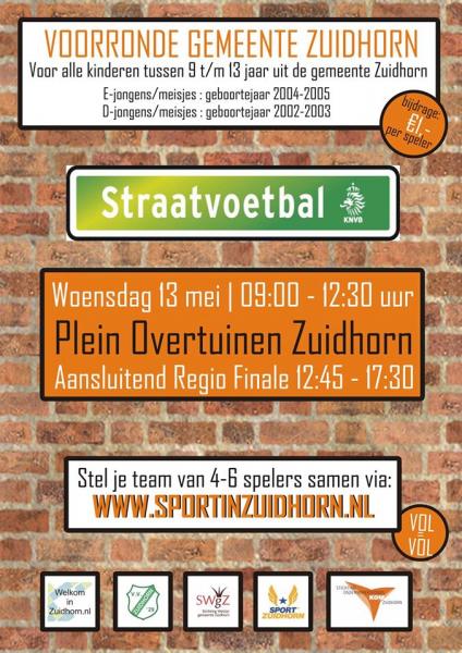 Na het succes van de vorige editie zal op woensdag 13 mei op het plein aan de Overtuinen in Zuidhorn het KNVB Straatvoetbaltoernooi plaatsvinden. Alle kinderen in de leeftijdscategorie van 9 t/m 13 jaar (geboortejaren 2002 t/m 2005) mogen zelf een team samenstellen en strijden voor een finaleplek in Amsterdam!