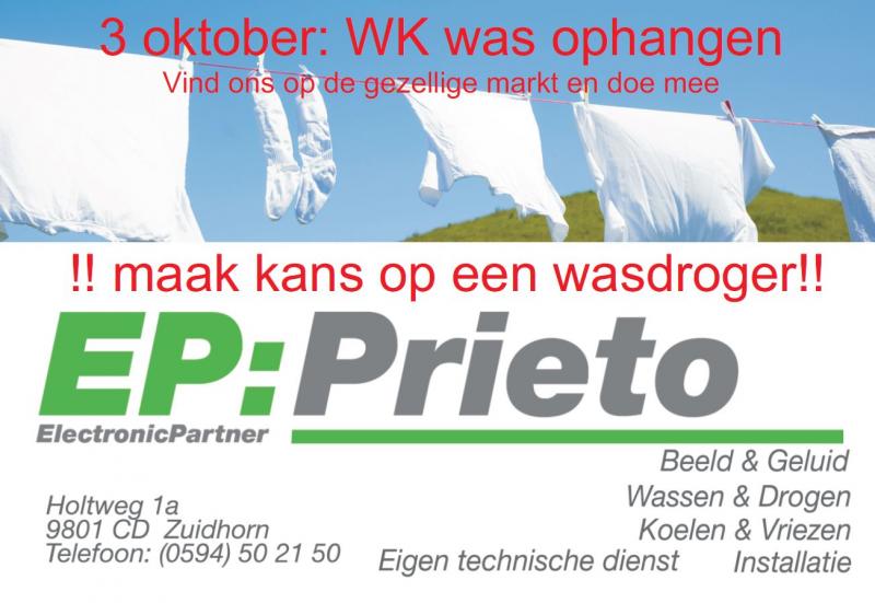 Wie hangt er zo snel mogelijk de was op en wint daarmee een wasdroger? Vind de stand van EP Prieto op de markt en doe mee!