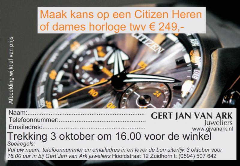 Lever de bon uit het magazine , (wat gratis verkrijgbaar is bij de winkeliers in Zuidhorn ) in bij Juwelier Gert jan van Ark en maak kans op een horloge twv € 249,-