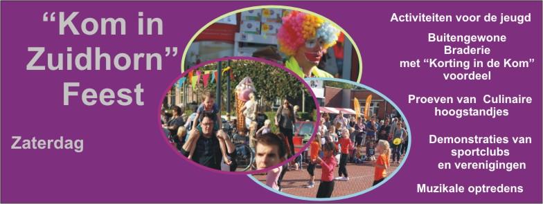 Het “Kom in Zuidhorn” feest wordt georganiseerd door Zakenkring Zuidhorn, Welkominzuidhorn.nl, Albert Heijn Zuidhorn, Stichting Welzijn. Onmisbaar is inbreng van de vrijwilligers van de Oranjemarkt Zuidhorn en mede mogelijk gemaakt door Stichting Ondernemers Kom Zuidhorn.