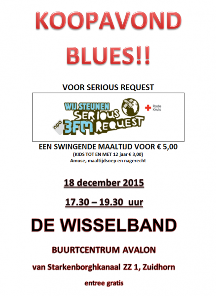 Extra vroeg ivm Serious Request.Je kunt eten in Avalon met muziek van de Wisselband, 5 euro pp, kids 3 euro. De opbrengst gaat naar Serious Request