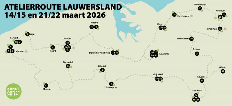 Achtendertig professionele kunstenaars wonend en werkend rondom het Lauwersmeer in NW Groningen en NO Friesland zetten hun atelier open voor publiek en vertellen graag over hun werk. Ook komende route zijn er veel nieuwe deelnemers en locaties.