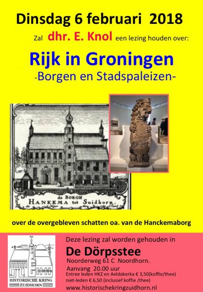 De Historische kring Zuidhorn organiseert deze avond een lezing over "Rijk in Groningen", welke aansluit bij de tentoonstelling in het Groninger Museum, in het jaar 2017. Vele overgebleven schatten van de verschillende borgen, waaronder de Hanckemaborg krijgen hierin aandacht. Voorafgaande aan de lezing is de jaarvergadering van de HKZ.