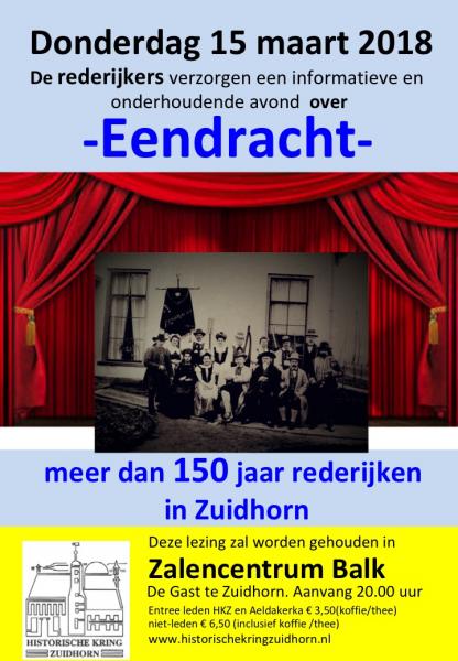 In de provincie Groningen waren opvallend veel rederijkerskamers in de afgelopen eeuwen. Zij hielden zich bezig met het beoefenen van de ‘welsprekendheid’, voordrachten, literatuur en toneel. Ook in Zuidhorn werd ‘gerederijkt’: meer dan honderdvijftig jaar geleden werd daar de rederijkerskamer Eendracht opgericht. Deze vereniging is nog altijd actief en voert jaarlijks een toneelvoorstelling op in het dorp. Maar er gebeurt nog veel meer binnen dat gezelschap van boeren, burgers en buitenlui.
