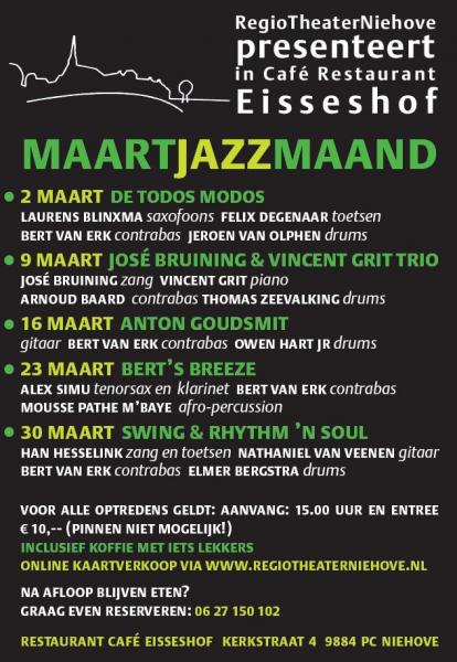 Het eerste optreden van de Jazzmaand in Niehove. Het gezelschap bestaat uit Felix Degenaar op toetsen, Laurens Blinxma op saxofoon, Jeroen van Olphen op drums en Bert van Erk op bas. Entree € 10,-