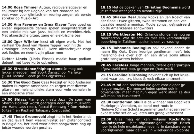 Bands: Gentleman Skull (pop/rock) Caroline’s Crossing (country/folk), Mind (alternative rock), Sjazz (flamenco/jazz) en Faceless (heavy rock) Singer/songwriters: Ann Faverey en Irma Klaver, Johannes Bodingius, Shakey Deal Tiedo (Groeneveld) en The Good Case, werktheater Moi, streetdance van SDM, dichter Lineïs, kinderboekenschrijfster Christien Boomsma, columnist Rosa Timmer en schrijver/journalist Igor Wijnker. Presentatie Greetje Meindertsma. Live schilders: Edwin Vis en Anna Hoes, ook hangt er een muzikaal doek van Reny Kramer. DJ Martijn Bosch van RocknRolla Soundsystem sluit M=A af.