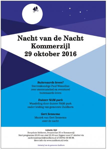 Zaterdagavond 29 oktober aanstaande organiseert gemeente Zuidhorn de Nacht van de Nacht in Kommerzijl. Sterrenkundige Paul Wesselius geeft hier een lezing over ons sterrenstelsel en eventueel buitenaards leven. Aansluitend vindt een avondwandeling plaats door het NAM-park. De avond wordt afgesloten door muzikant Gert Sennema uit Grijpskerk die enkele liedjes over de nacht zingt.