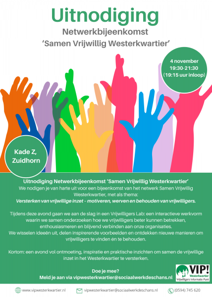 Graag nodigen we je uit voor een netwerkbijeenkomst van Samen Vrijwillig Westerkwartier, het netwerk van VIP Westerkwartier waarin organisaties, verenigingen en initiatieven samenkomen die werken met vrijwilligers in het Westerkwartier.