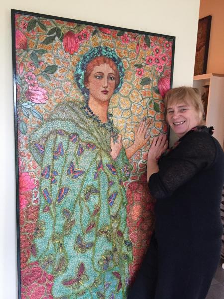 Het levensgrote vrouwen portret dat ze opbouwde uit honderden stukjes gescheurd papier en daarna bewerkt met vele kleuren en stipjes.