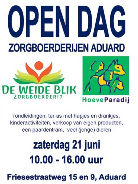 Open Dag op Zorgboerderij Hoeve Paradij Aduard. Met rondleidingen, kinderactiviteiten, een terras met hapjes en drankjes, verkoop van eigen producten, gratis beschuit met aardbeien en vooral heel veel (jonge) dieren.