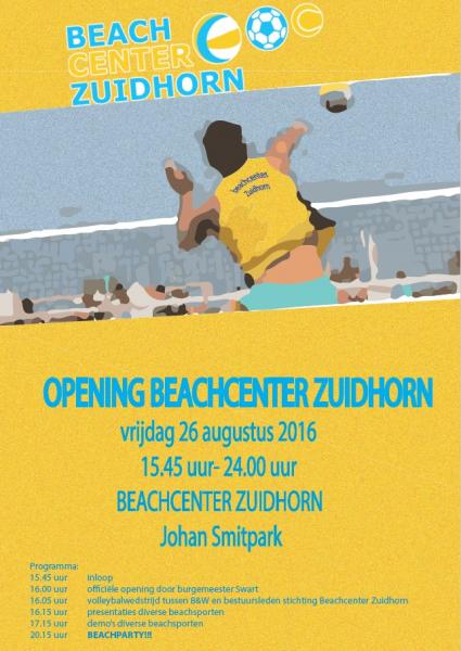 Vrijdag 26 augustus 2016 zal BEACHCENTER ZUIDHORN worden geopend. In het Johan Smitpark zal burgemeester Swart om 16.00 uur de velden officieel openen. Na de opening zullen verschiilende beachsporten zich presenteren. De BEACHPARTY start om 20.15 uur.