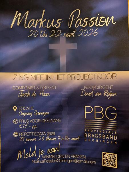 Zing mee met het projectkoor van de Provinciale BrassBand Groningen. Dirigent David van Reijen. (Uitvoering op 20 t/m 22 maart)