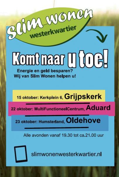 De 4 Westerkwartiergemeenten Leek, Marum Grootegast en Zuidhorn geven invullingaan het 100.000 woningenplan van de noordelijke provincies. Een ambitieus plan om de energieprestatie van de bestaande woningvoorraad te verbeteren. We willen u, als woningeigenaar in onze gemeenten, graag helpen bij het energiezuiniger maken van uw woning. Het project Slim Wonen in het Westerkwartier 2012-2015 moet zorgen dat in de komende 3 jaar in het Westerkwartier jaarlijks 159 particuliere woningen energiezuiniger worden. Door energiebesparing en/of opwekking van duurzame energie moeten deze woningen ten minste 2 stappen op het energielabel omhoog gaan.