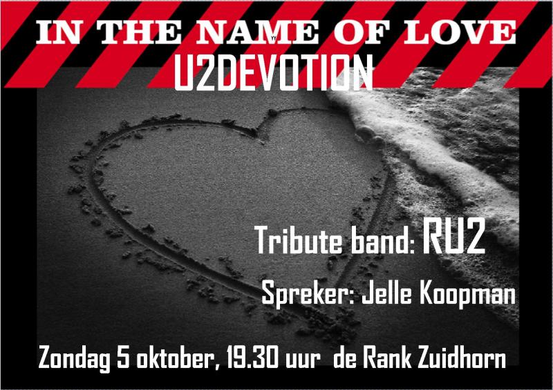 Een bijzondere super speciale Devotion avond in kerk ‘de Rank’ in Zuidhorn: dan worden de rocksongs van de wereldberoemde band U2 ten gehore gebracht. De songs worden live gespeeld door RU2. Deze band is opgeklommen tot één van de beste en meest succesvolle U2 tribute bands van de Benelux. Ze komen uit Limburg en door hun sound, uitstraling en enthousiasme, spat het U2-gevoel van het podium af. Ze gaan bekende nummers spelen zoals: ‘I still haven't found what I'm looking for’, ‘One’, ‘Where the Streets have no name’, ‘A beautiful day’, ‘Pride in the name of love’ en nog veel meer.Naast deze spetterende en sprekende songs van U2 kun je ook luisteren naar Jelle Koopman. Hij komt met een boodschap over echte liefde, bevrijding en hoop. Het thema van deze muzikale avond is: In the name of love. U2Devotion 5 oktober om 19:30 uur in de Rank te Zuidhorn. Vanaf 19:00 uur staat de koffie en/of thee voor je klaar. De toegang deze avond is helemaal gratis maar vol is vol! Na afloop is er een deurcollecte voor dekking van onkosten.