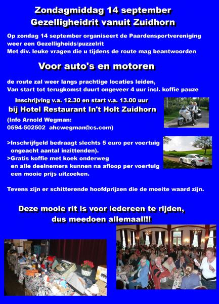 De Paardensportver. organiseert weer een gezelligheids/puzzelrit met div. leuke vragen die u tijdens de route moet beantwoorden. Voor auto’s en motoren de route zal weer langs prachtige locaties leiden, duur van de tocht is totaal ongeveer 4 uur incl. koffie pauze