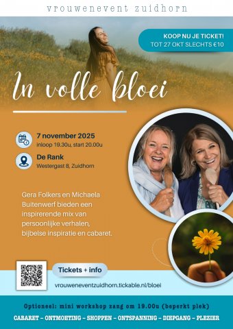 Op 7 november organiseren we een avond voor vrouwen in De Rank, Westergast 8 in Zuidhorn. De inloop is vanaf 19.30 uur, de avond begint om 20.00 uur. We hebben Gera Folkerts en Michaela Buitenwerf uitgenodigd te komen spreken over het thema 'In volle bloei'. Opgave kan via: vrouweneventzuidhorn.tickable.nl/bloei De earlybird ticket kost € 10,--. Na 27 oktober € 13,50. Dit is inclusief consumpties. We hebben een aantal leuke kraampjes en houd je van zingen, kom dan om 19.00 uur naar de zangworkshop. Er wordt een lied ingestudeerd die aan het begin van de avond gezongen wordt. Wil je daaraan meedoen, geef dat dan aan bij de opgave. We hopen jullie te zien! Arike, Annelies, Joanne, Marjoke, Tiny en Jetty